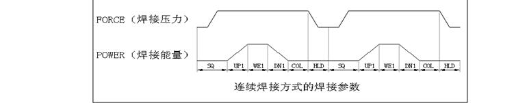 在連續(xù)焊接工作模式下,只能使用單脈沖焊接(第一脈沖),所以第二焊接脈沖的參數(shù)(UP2,WE2,DN1,ENERG2)均不使用,而且COL,HLD參數(shù)的定義與基本焊接模式有所不同,其各個(gè)焊接參數(shù)的邏輯關(guān)系參看圖。